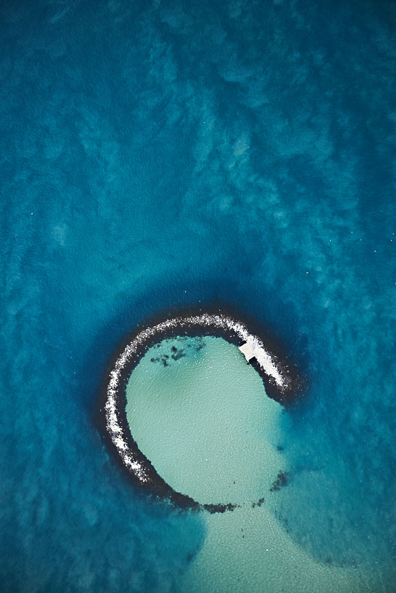 ‘Popes Eye‘ is photographed hand held, from a light aircraft flying over the stretch of water between Queenscliff and Sorrento. The tide is low and the clarity of the water was particularly beautiful on this day, highlighting the unusual shape of the man made rock formations of Popes Eye. This artificial reef and marine sanctuary is a haven for sea life like dolphins, seals and sting rays making it a popular spot for diving and snorkelling. The black rock is basalt which contrasts beautifully with the colour of the ocean.