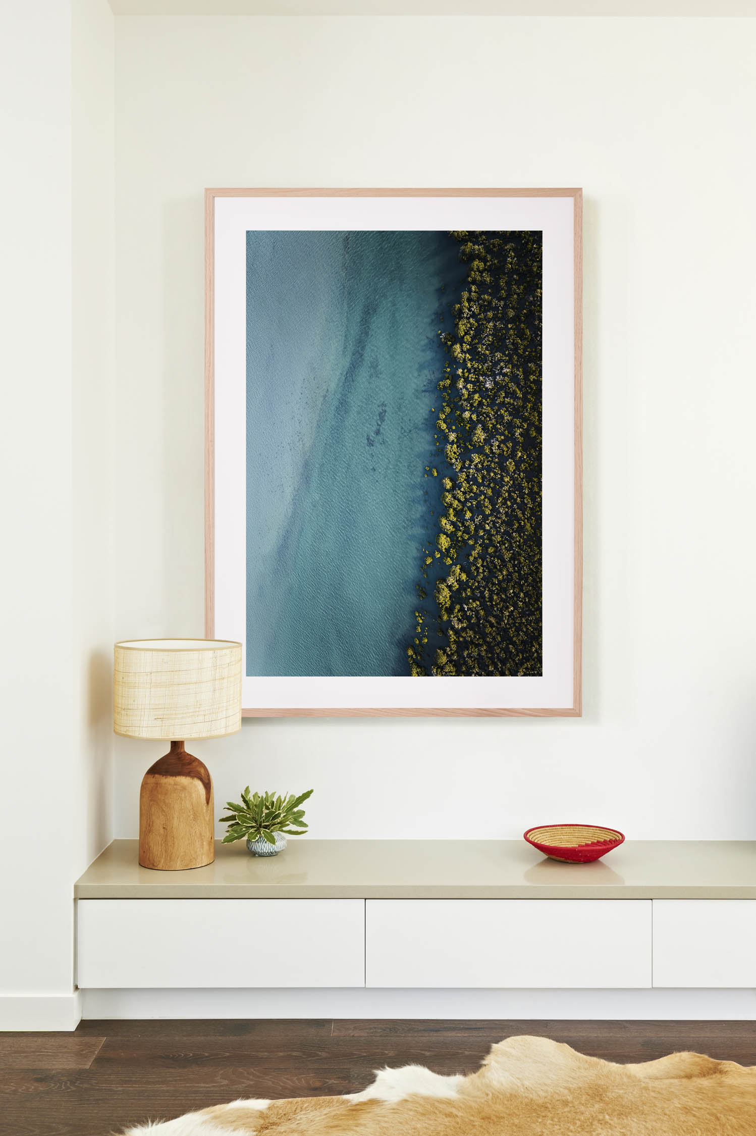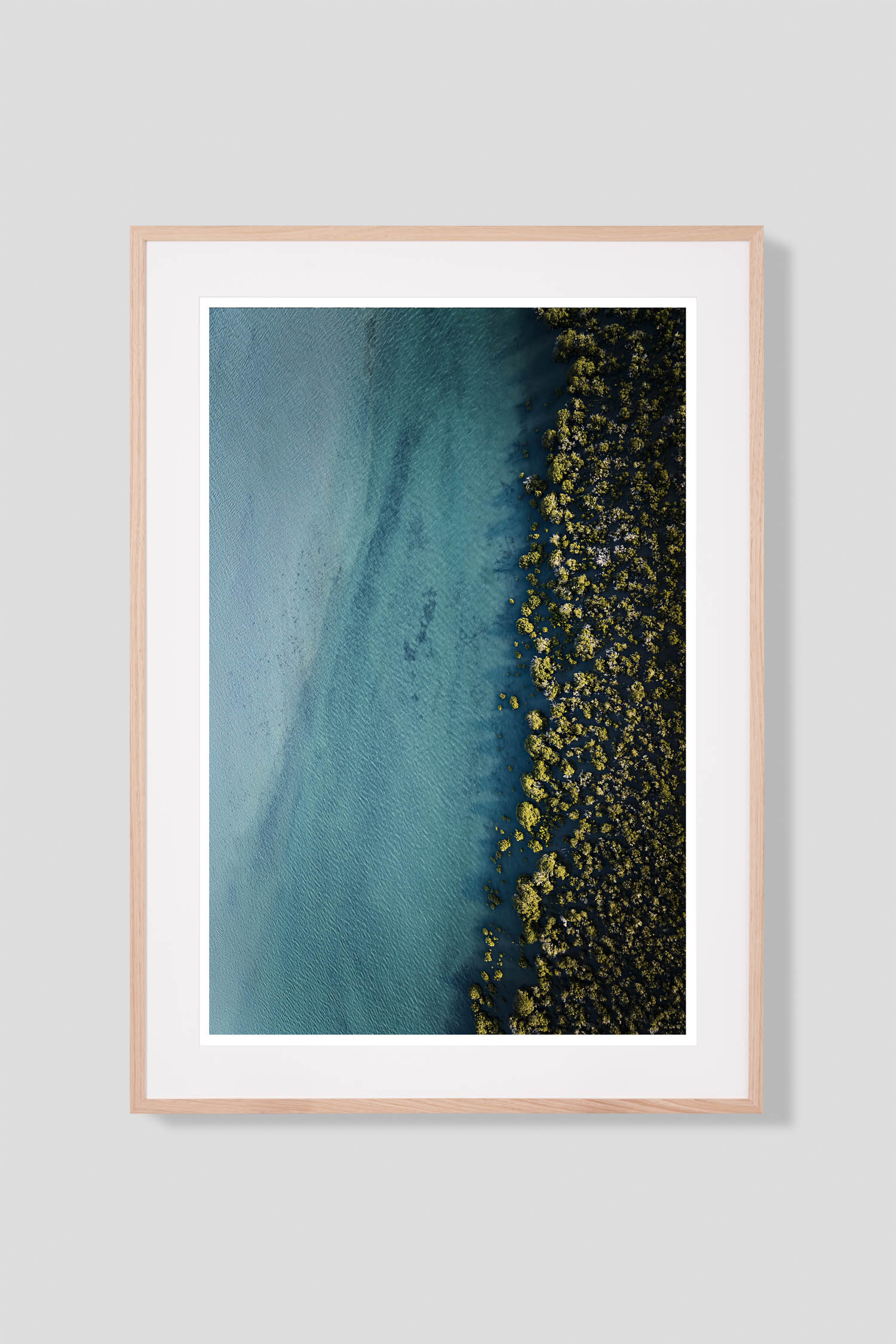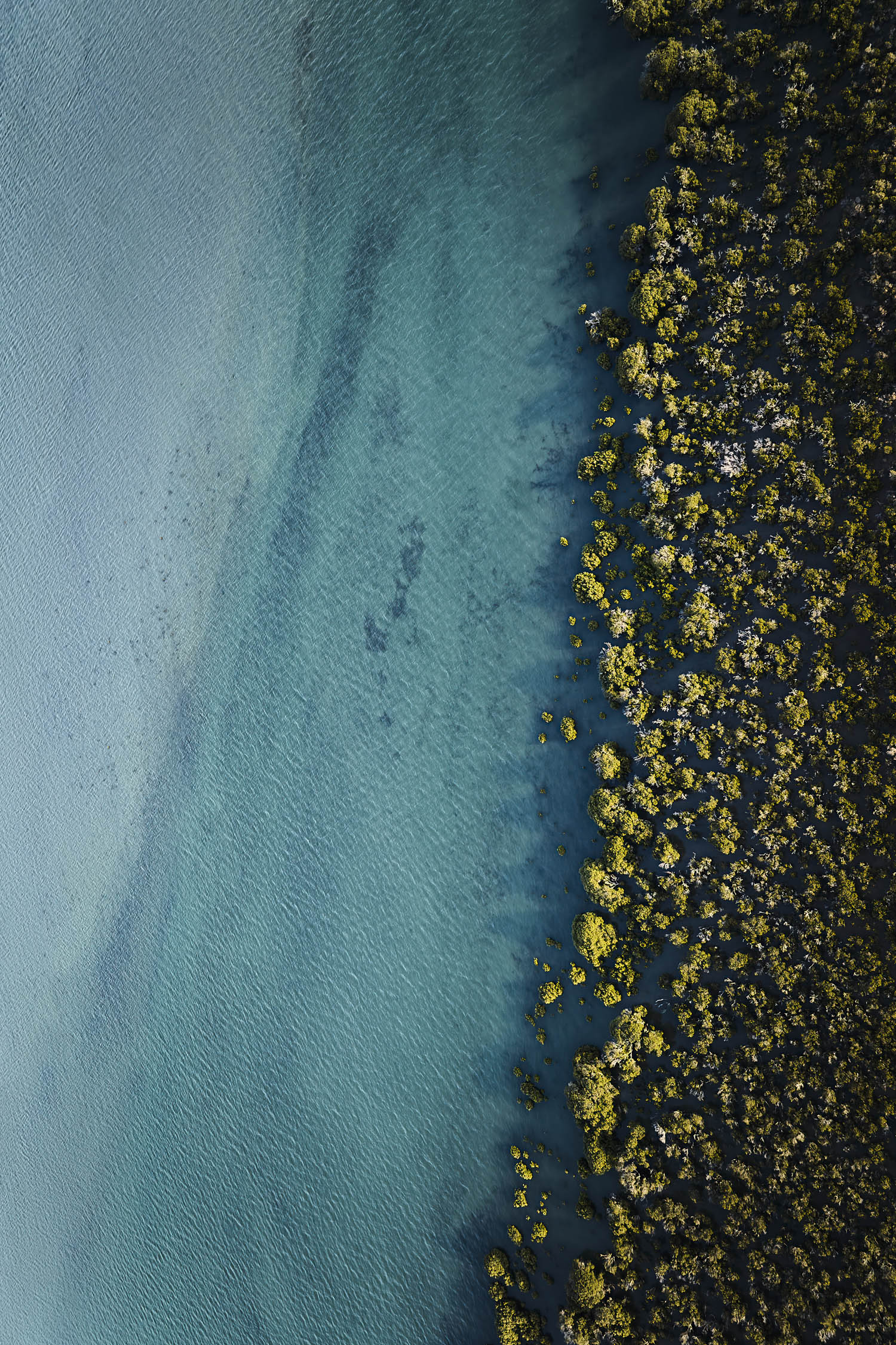 ‘Tidal Edge’ is photographed from an aerial perspective, above the Barwon Heads river. In the soft afternoon light, the incoming tide reveals a canvas of sandy textures above and below the surface. The ingoing and outgoing tide of the river, is always changing the landscape along the estuary and on the river’s edge and the last rays of light catch the low shrubs submerged in the river, creating beautiful textured shapes. This image can be hung vertically or horizontally (with shrubs at base of print).